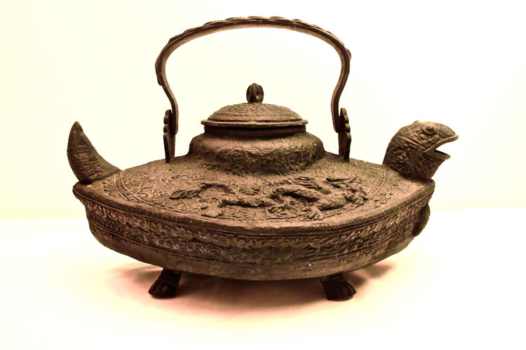 Kettle of bronze in stylized turtle-form, boat-shaped with open mouthed head as spout and ornamented with floral and geometric decoration of dragons and fish in relief. 18th or early 19th century, Brunei, Borneo. L 28.00 cm. Acquired: Brussels.